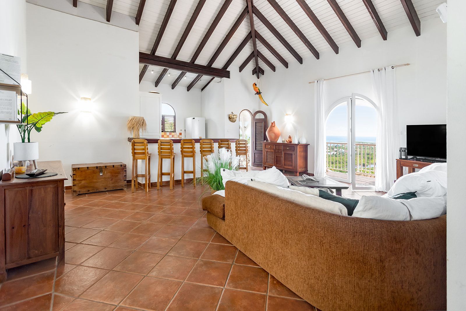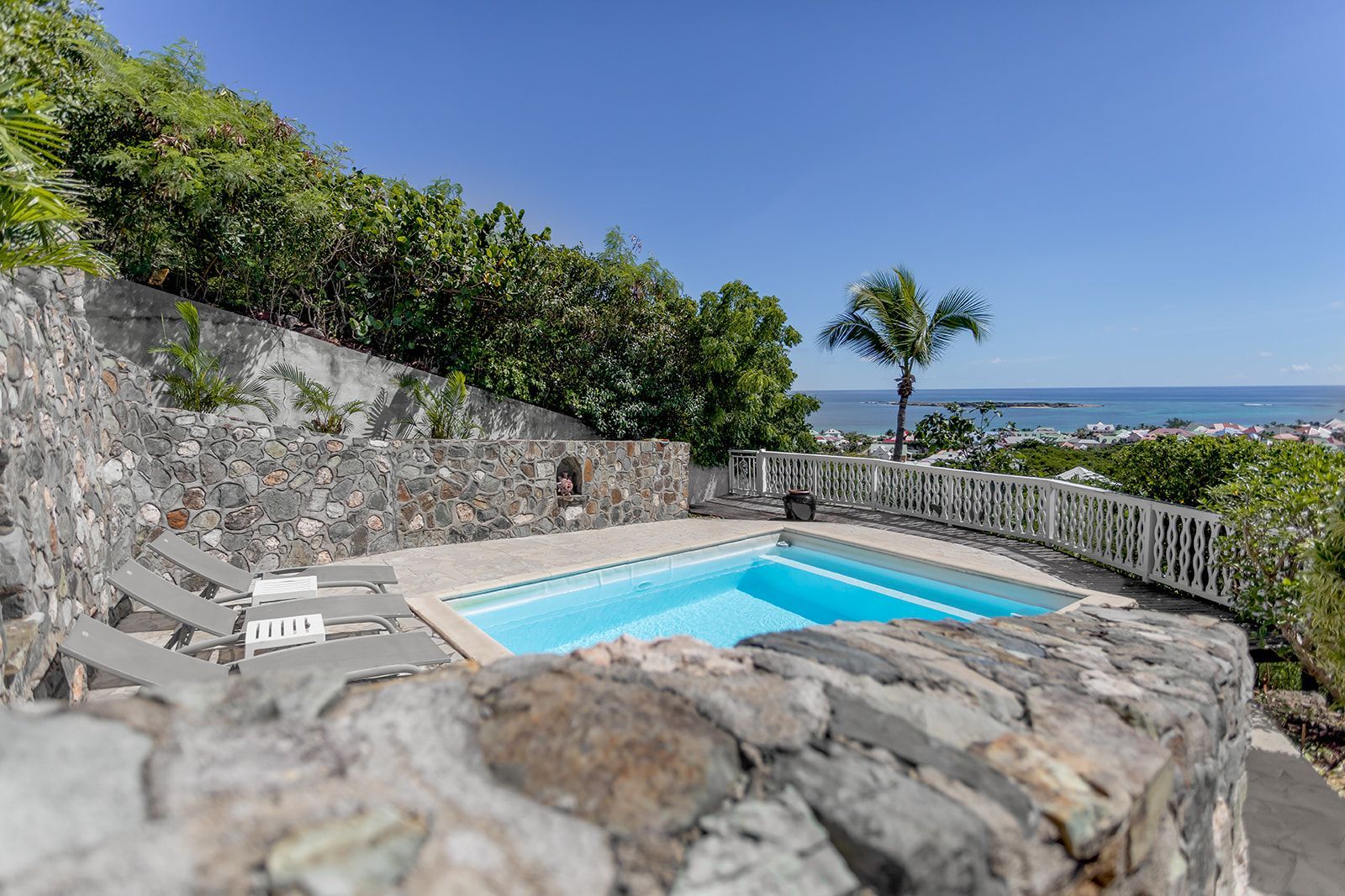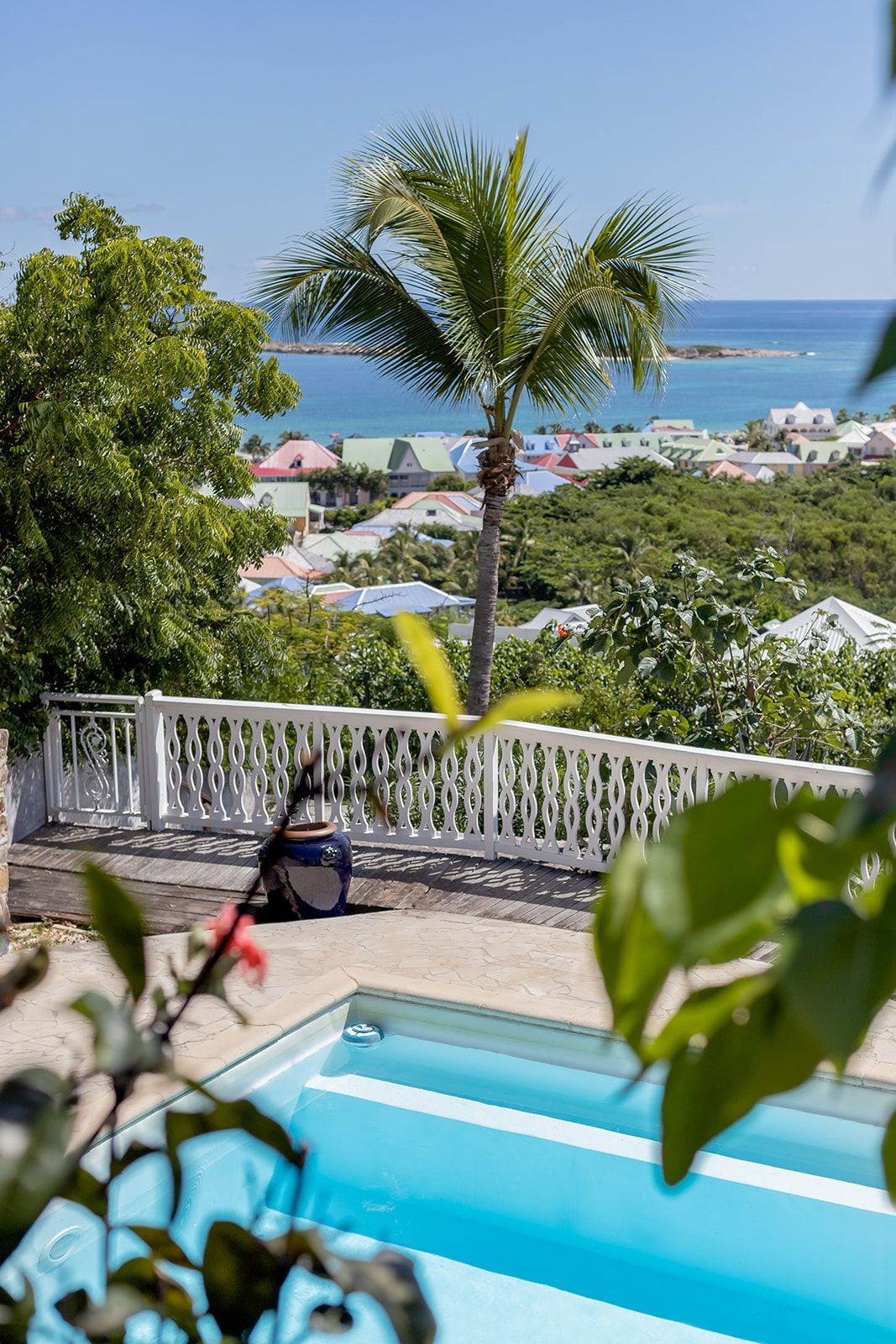 Stepping onto the terrace reveals the villa's unique character, offering a breathtaking 180-degree view of Orient Bay and the neighboring island of St. Barth. The covered area provides options for shade throughout the day, while the remainder of the terrace, along with the pool, invites you to soak up the sun.