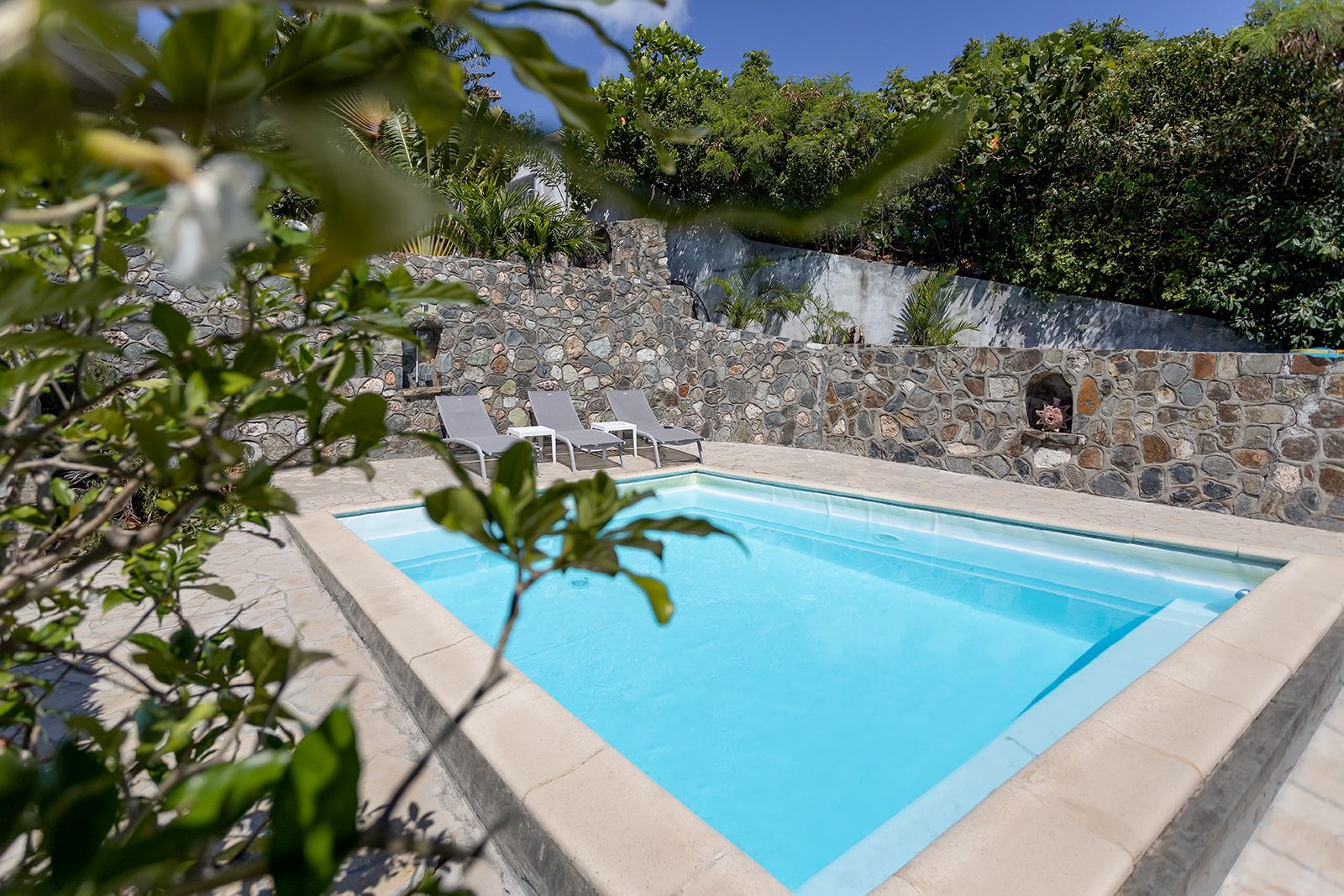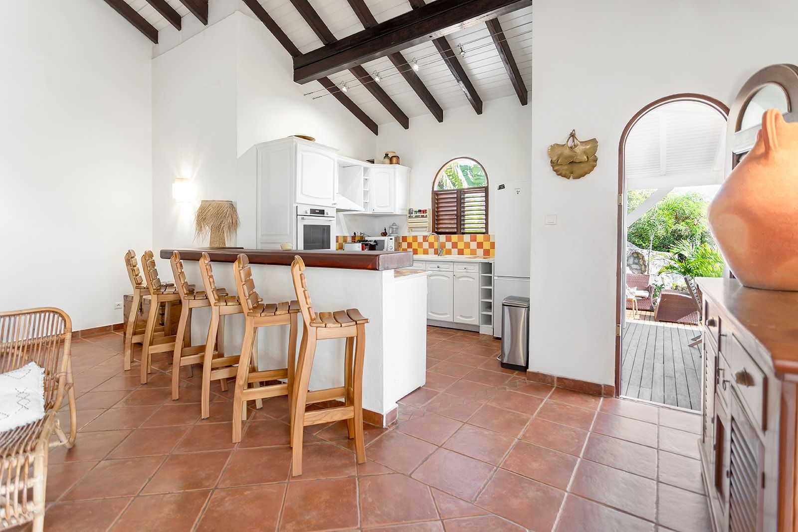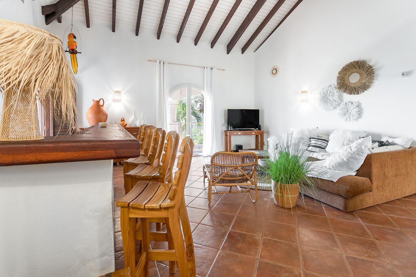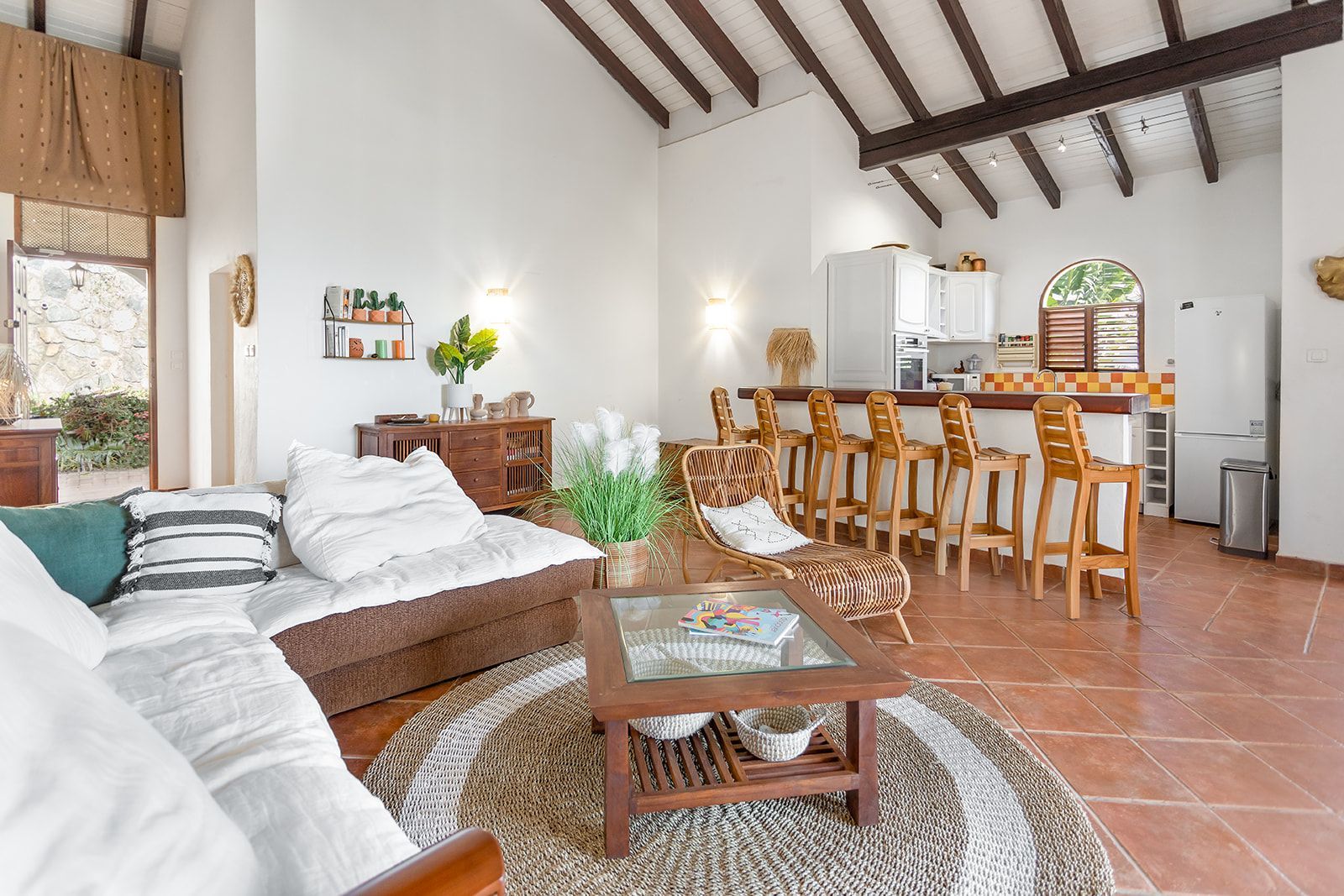 Stepping onto the terrace reveals the villa's unique character, offering a breathtaking 180-degree view of Orient Bay and the neighboring island of St. Barth. The covered area provides options for shade throughout the day, while the remainder of the terrace, along with the pool, invites you to soak up the sun.