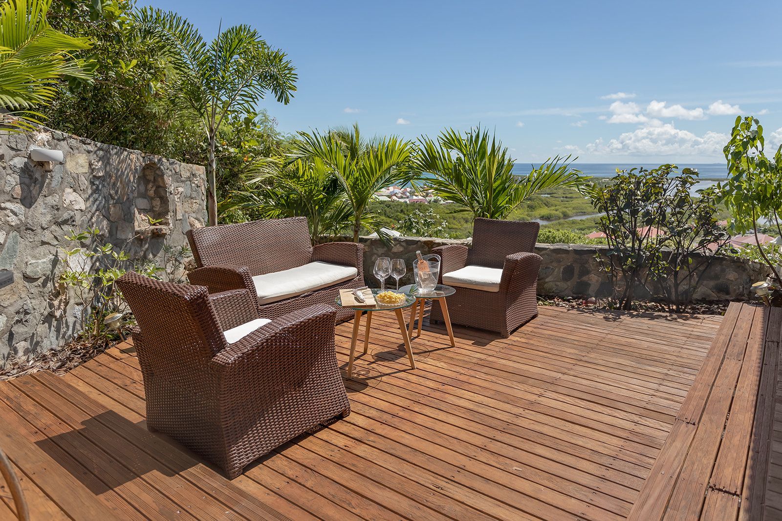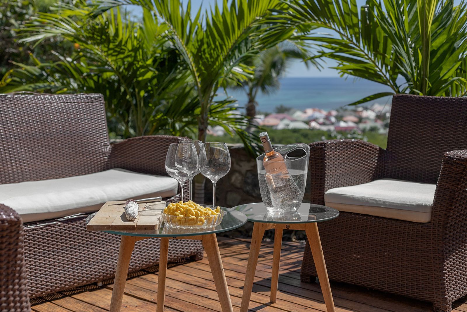 On the terrace, with the view of the Orient Beach and St. Barth.